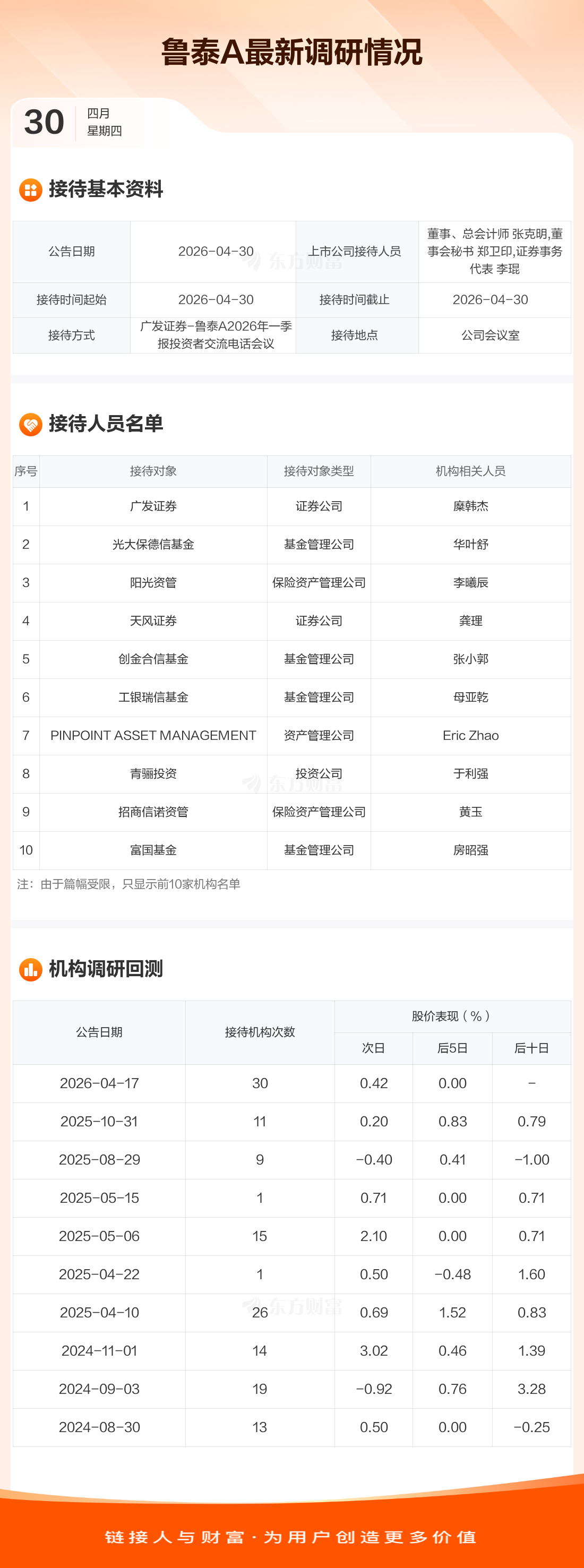 鲁泰A4月30日公告称,4月30日接待广发证券等16家机构调研。接待人员包括董事、总会计师 张克明,董事会秘书 郑卫印,证券事务代表 李琨。