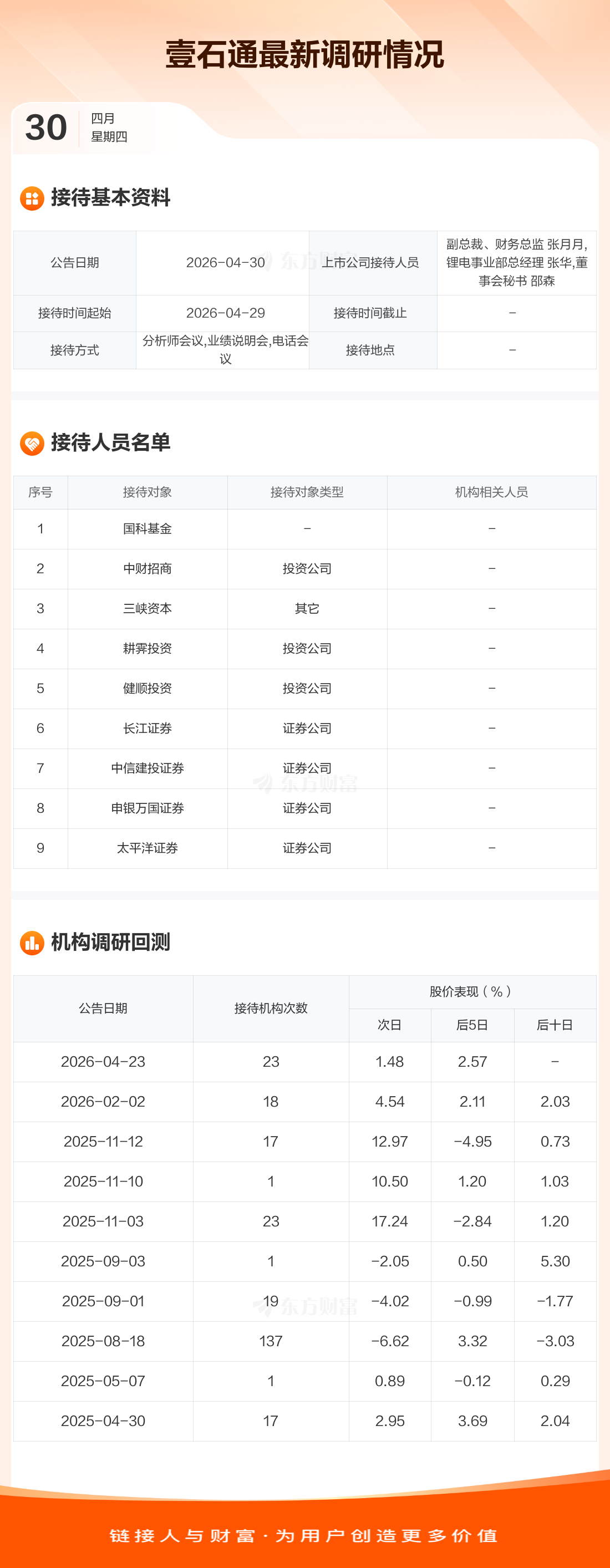 壹石通4月30日公告称,4月29日接待国科基金等9家机构调研。接待人员包括副总裁、财务总监 张月月,锂电事业部总经理 张华,董事会秘书 邵森。