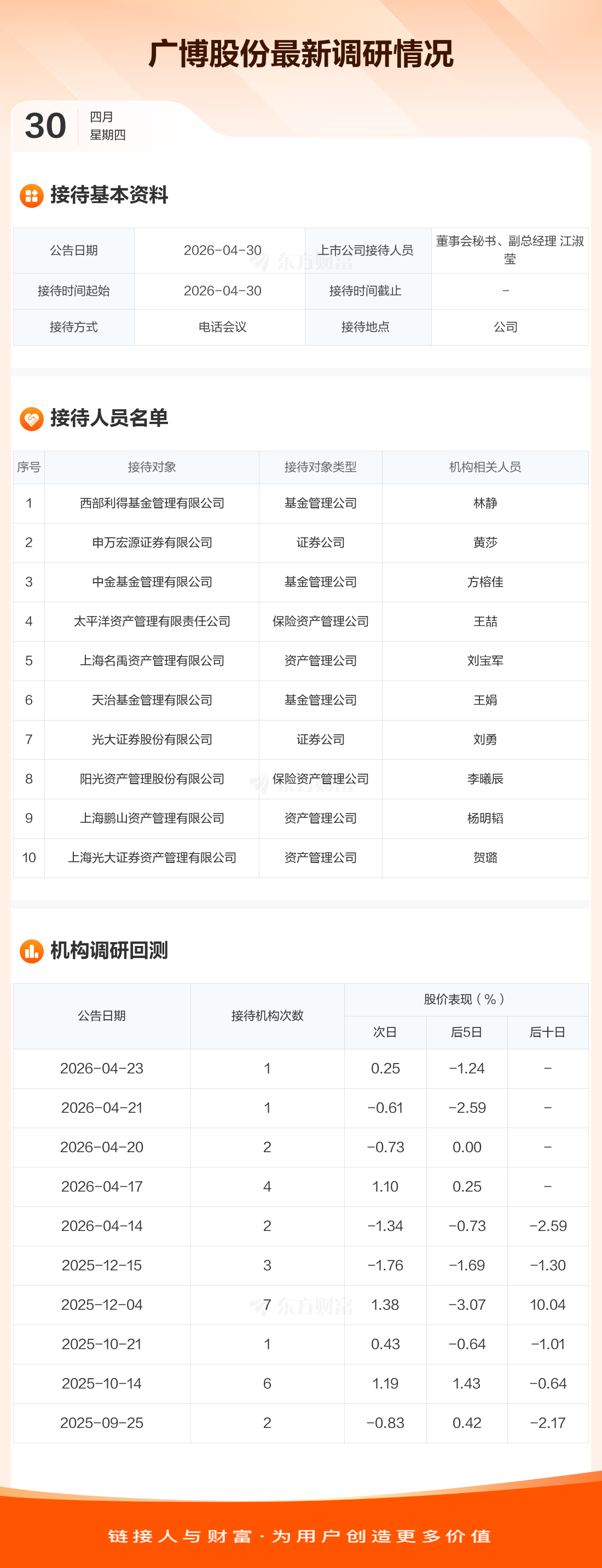 广博股份4月30日公告称,4月30日接待西部利得基金管理有限公司等10家机构调研。接待人员包括董事会秘书、副总经理 江淑莹。