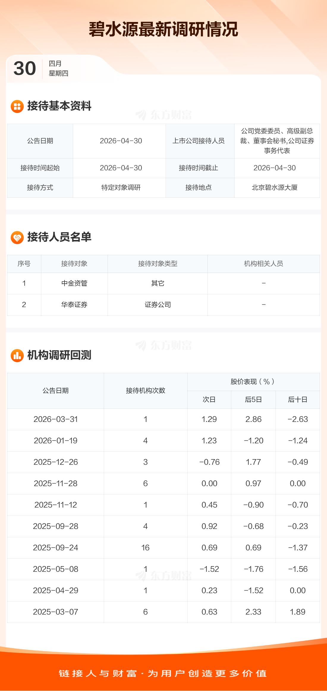 碧水源4月30日公告称,4月30日接待中金资管等2家机构调研。接待人员包括公司党委委员、高级副总裁、董事会秘书,公司证券事务代表。