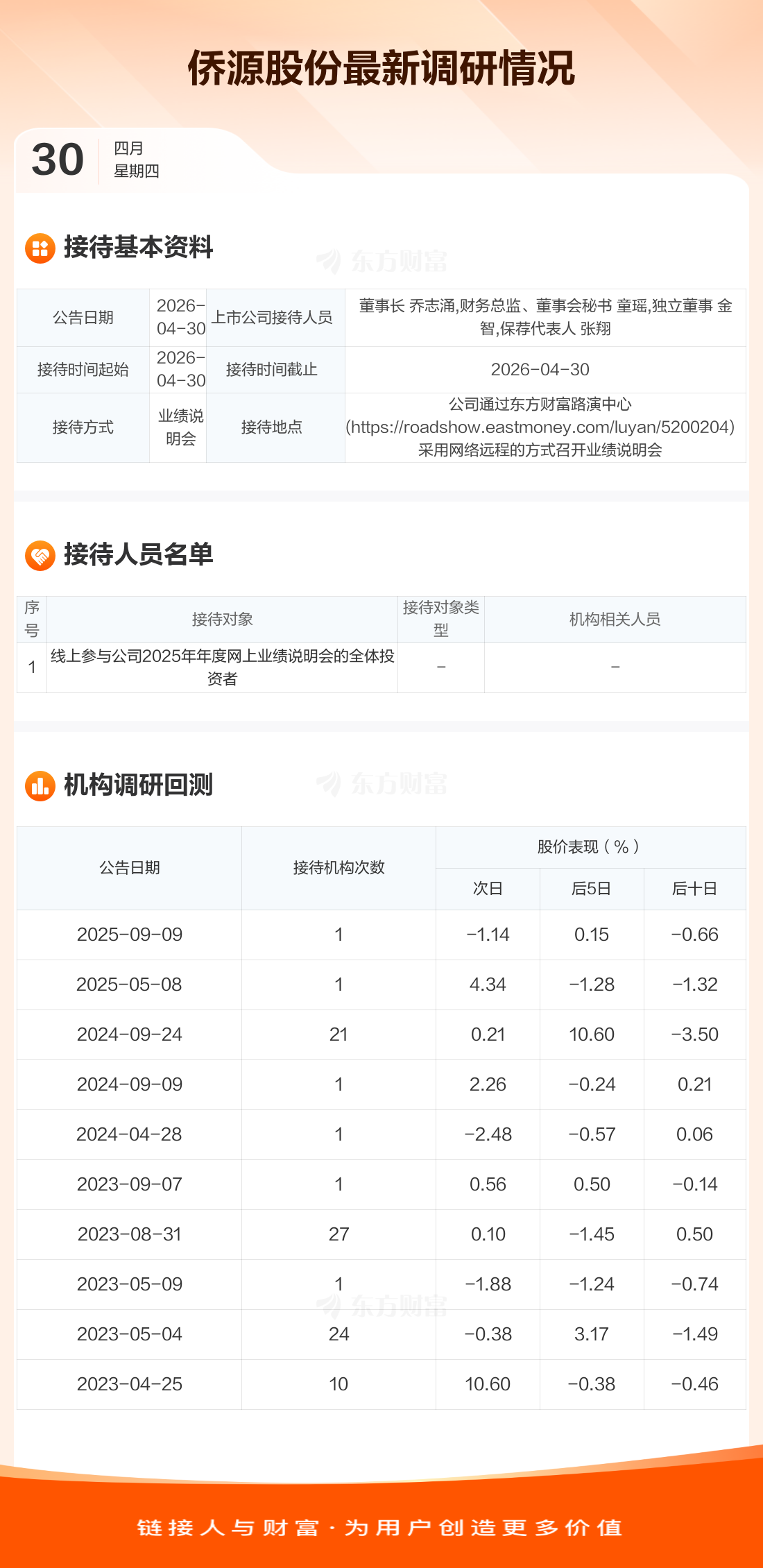 侨源股份4月30日公告称,4月30日接待线上参与公司2025年年度网上业绩说明会的全体投资者调研。接待人员包括董事长 乔志涌,财务总监、董事会秘书 童瑶,独立董事 金智,保荐代表人 张翔。