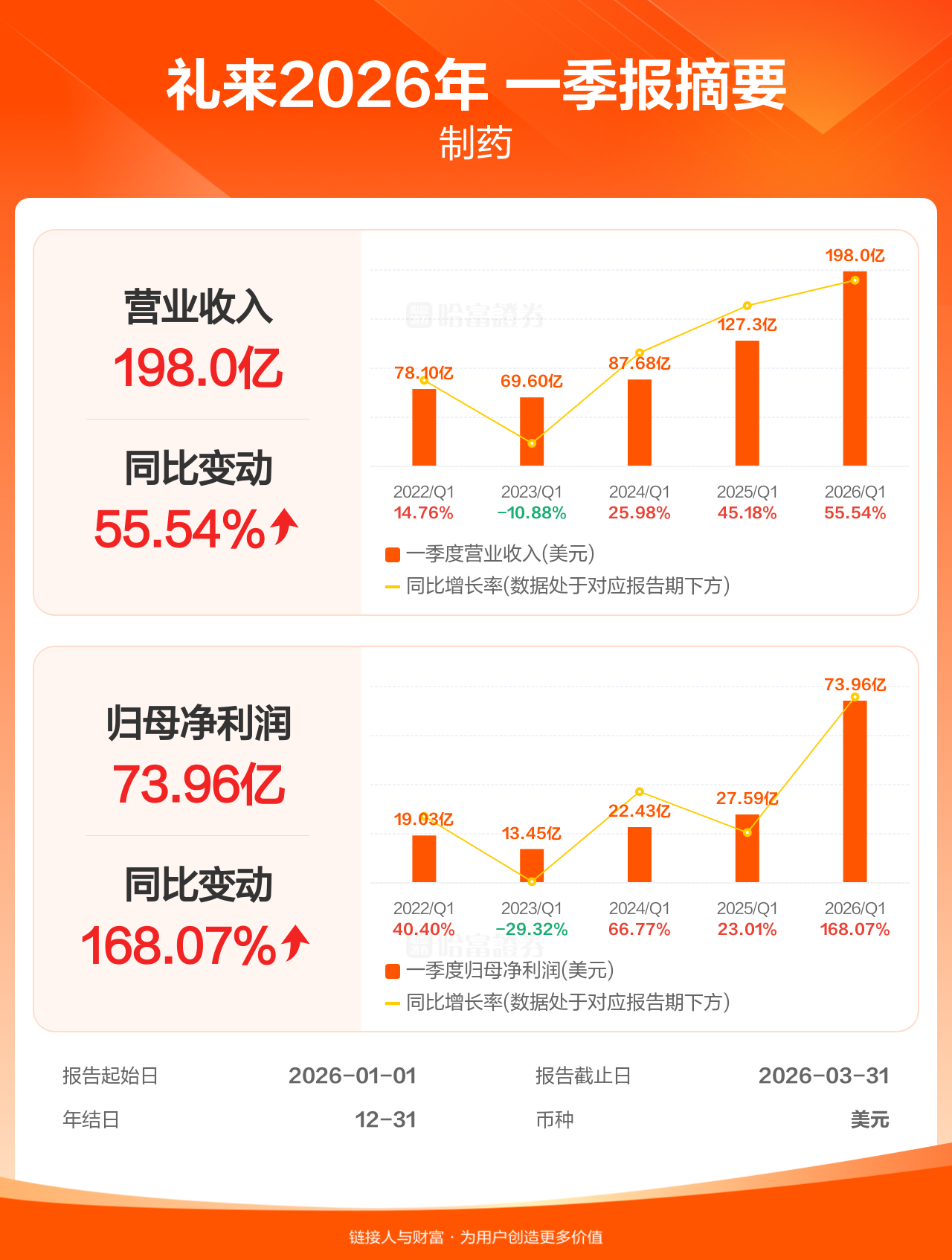 礼来4月30日发布一季报业绩,截至2026年3月31日的3个月内,该公司营业收入197.99亿美元,同比增长55.54%;公司权益持有人应占溢利(归母净利润)73.96亿美元,同比增长168.07%。