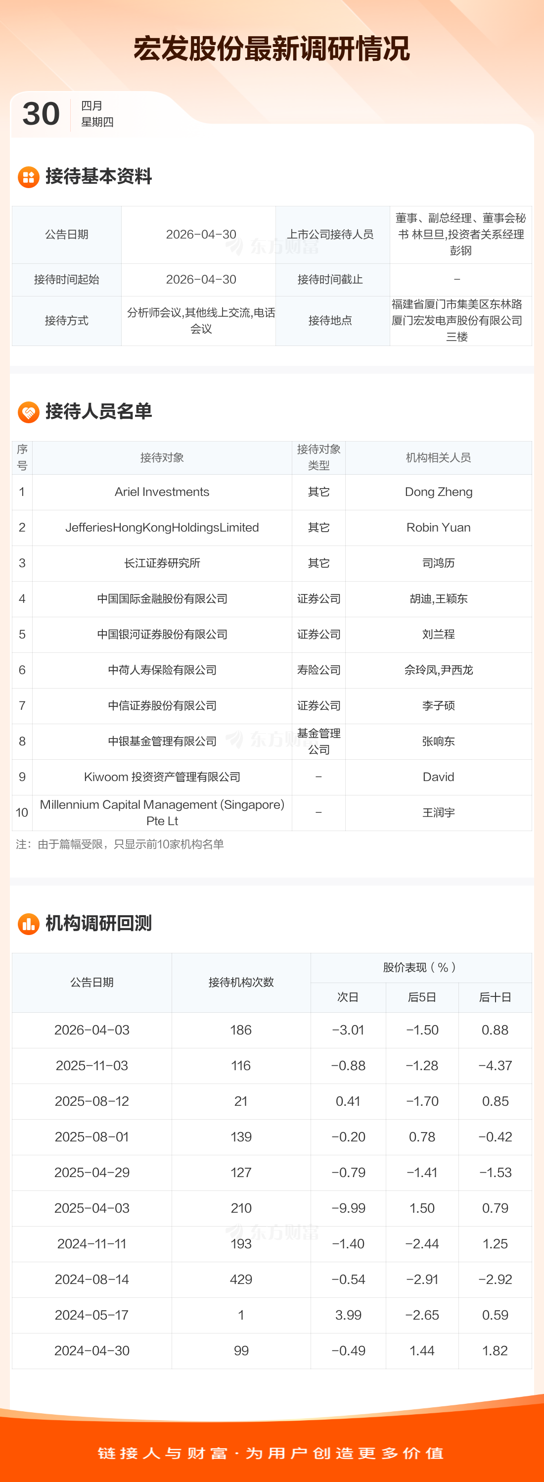 宏发股份4月30日公告称,4月30日接待Ariel Investments等105家机构调研。接待人员包括董事、副总经理、董事会秘书 林旦旦,投资者关系经理 彭钢。