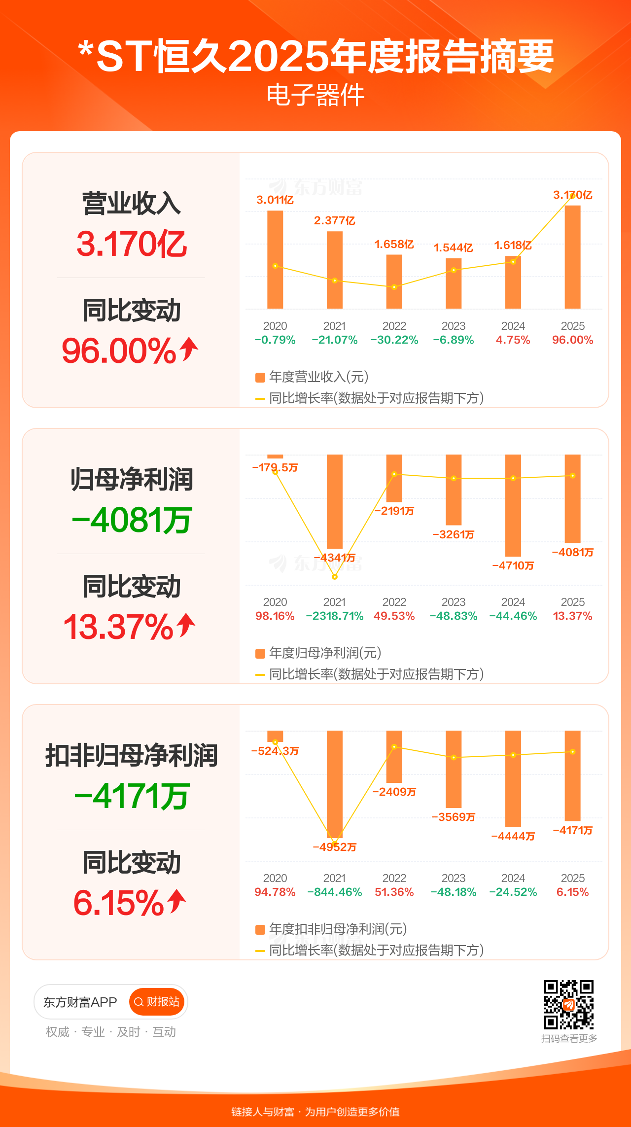 *ST恒久4月30日发布2025年年报显示,公司全年实现营业收入3.17亿元,同比增长96.00%;归母净利润-4080.56万元;扣非归母净利润-4170.91万元。