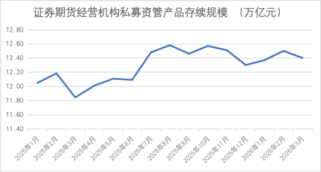 报告显示,截至2026年3月底,证券期货经营机构私募资管业务规模合计12.40万亿元(不含社保基金、企业年金),较上月底减少947.01亿元,环比下降0.76%。