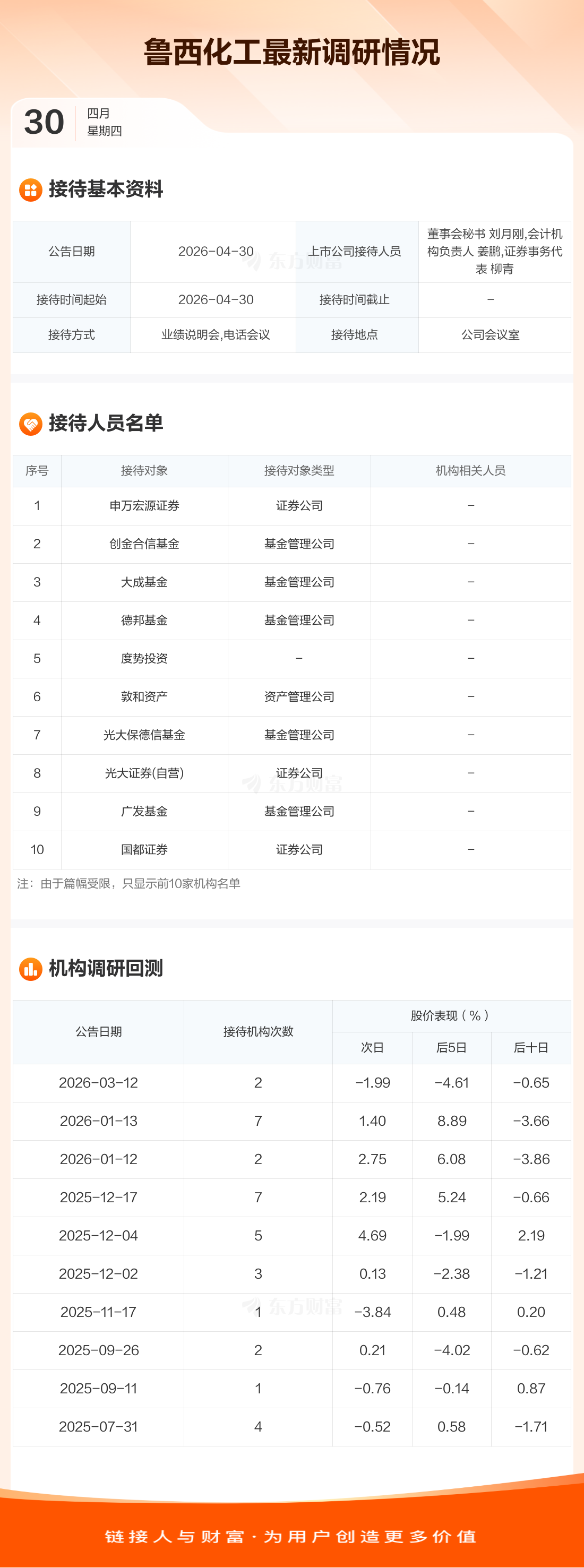 鲁西化工4月30日公告称,4月30日接待申万宏源证券等45家机构调研。接待人员包括董事会秘书 刘月刚,会计机构负责人 姜鹏,证券事务代表 柳青。