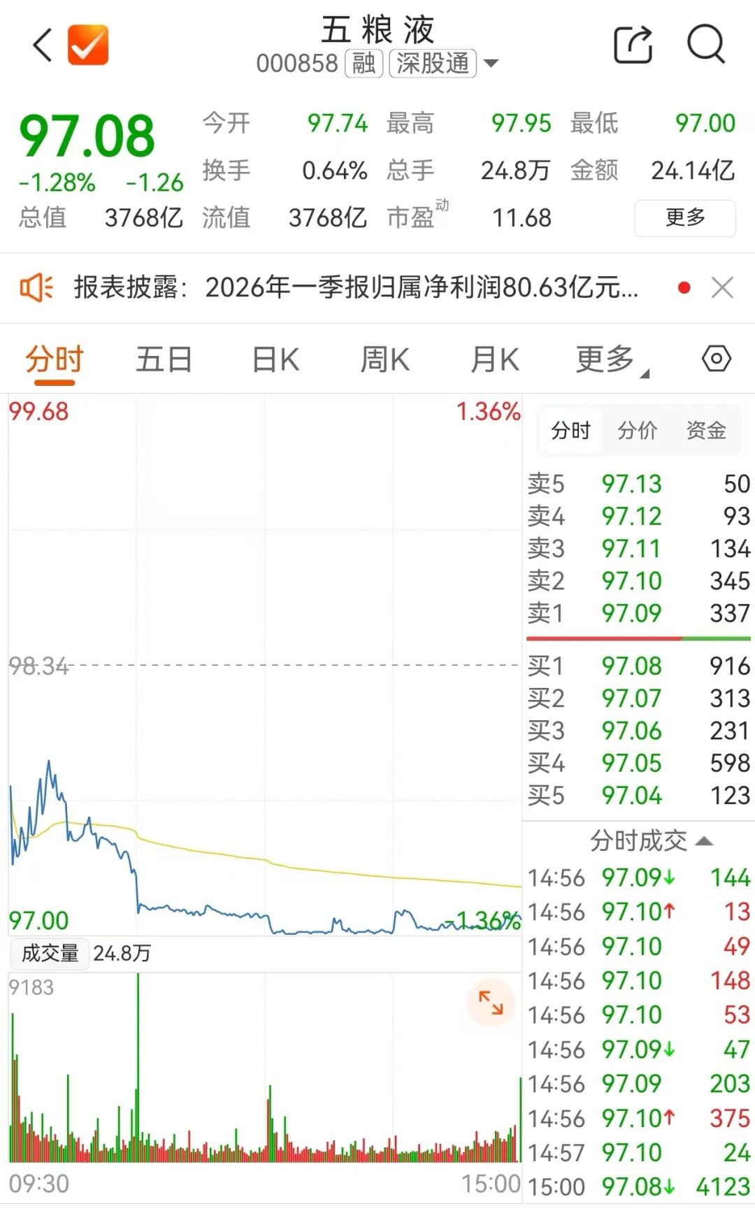 二级市场方面,截至4月30日收盘,五粮液报97.08元/股,跌1.28%,总市值3768亿元。