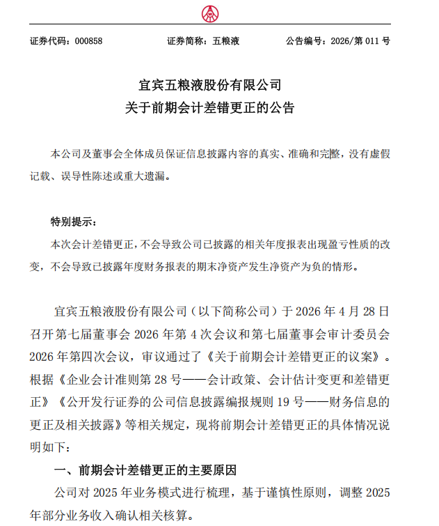 五粮液在同日发布的关于前期会计差错更正的公告中表示,基于对2025年业务模式的梳理及谨慎性原则,公司调整2025年部分业务收入确认相关核算。公司明确,本次会计差错更正,不会导致公司已披露的相关年度报表出现盈亏性质的改变,不会导致已披露年度财务报表的期末净资产发生净资产为负的情形。