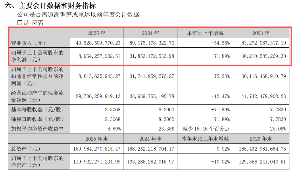 2025年年报显示,公司实现营业收入405.29亿元,同比下降54.55%;归属于上市公司股东的净利润89.54亿元,同比下降71.89%。利润分配方面,公司拟以38.82亿为基数,向全体股东每10股派发现金红利25.78元(含税),不送红股,不以公积金转增股本。
