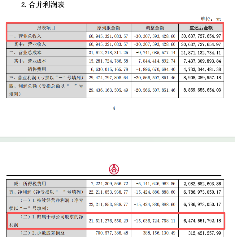 五粮液还同步发布了2025年一季报、半年报和三季报三份“更新报告”,对此前已披露的季度数据进行追溯调减。其中,2025年前三季度的营收由此前披露的609.45亿元调减至306.38亿元,归母净利润从215.11亿元调减至64.75亿元,下调幅度分别约50%和70%。
