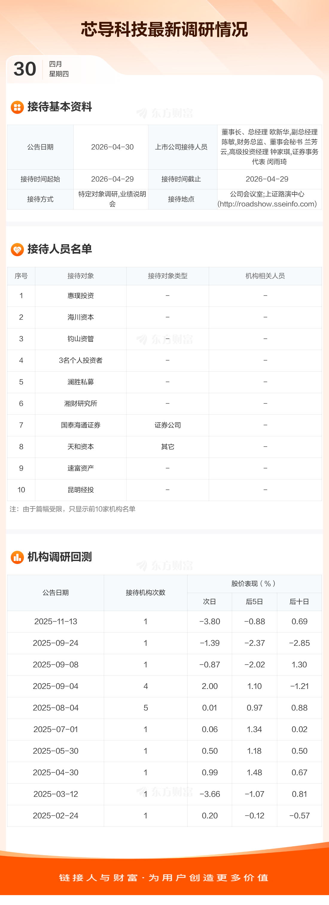 芯导科技4月30日公告称,4月29日接待惠璞投资等13家机构调研。接待人员包括董事长、总经理 欧新华,副总经理 陈敏,财务总监、董事会秘书 兰芳云,高级投资经理 钟家琪,证券事务代表 闵雨琦。