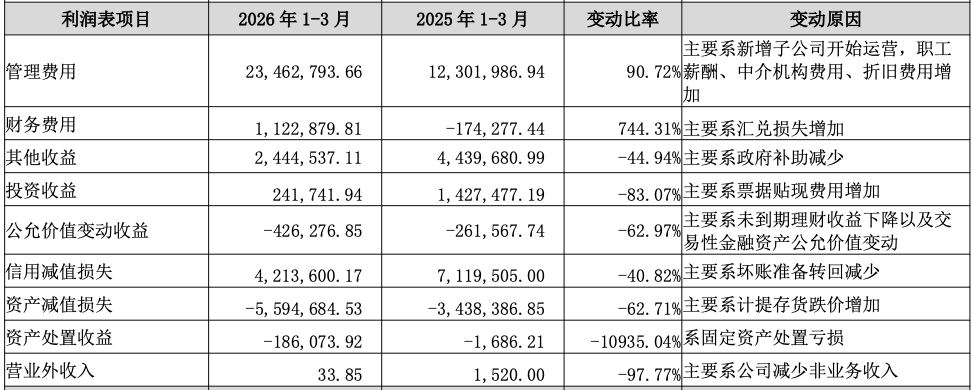2026年一季度,公司管理费用同比增长90.72%,主要系新增子公司开始运营,职工薪酬、中介机构费用、折旧费用增加;财务费用同比大幅增长744.31%,主要系汇兑损失增加。