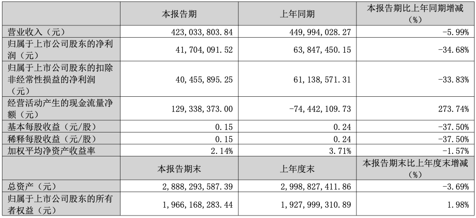 截至一季度末,公司总资产28.88亿元,较上年度末下降3.7%;归母净资产为19.66亿元,较上年度末增长2.0%。