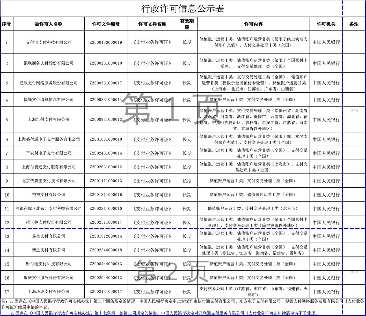 包括支付宝、银联商务、通联支付、快钱支付、上海汇付等共17家支付机构完成牌照续展,支付牌照有效期由5年变更为长期。