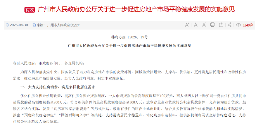 4月30日,继深圳之后,广州市出台《关于进一步促进房地产市场平稳健康发展的实施意见》,提出八条支持措施,涵盖住房消费支持、卖旧买新置换、房票效能提升、土地供应优化、居住品质升级、存量资产盘活、行业环境规范、城市更新推进八大方面。