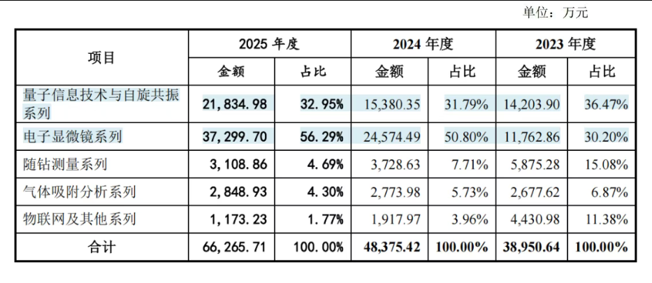 招股书显示,撑起国仪量子营收基本盘的,并非高大上的量子计算机,而是正处于国产替代风口上的电子显微镜。2025年,电子显微镜系列的营收占比超过56%;2025年前五大客户(中国科学院、浙江大学、北京橙时代进出口有限公司等)采购中,电子显微镜系列产品占据了主导地位。