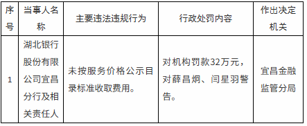 【大河财立方消息】4月30日,国家金融监督管理总局宜昌监管分局披露的行政处罚信息显示,因未按服务价格公示目录标准收取费用,湖北银行宜昌分行被罚32万元,相关责任人薛昌炯、闫星羽被警告。