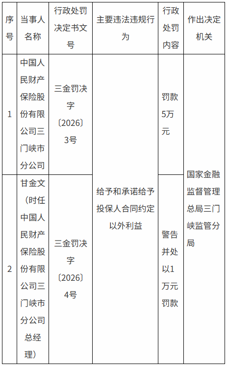 【大河财立方消息】4月30日,国家金融监督管理总局三门峡监管分局披露的行政处罚信息显示,因给予和承诺给予投保人合同约定以外利益,中国人民财产保险股份有限公司三门峡市分公司被罚5万元,时任该公司总经理甘金文被警告并处以1万元罚款。