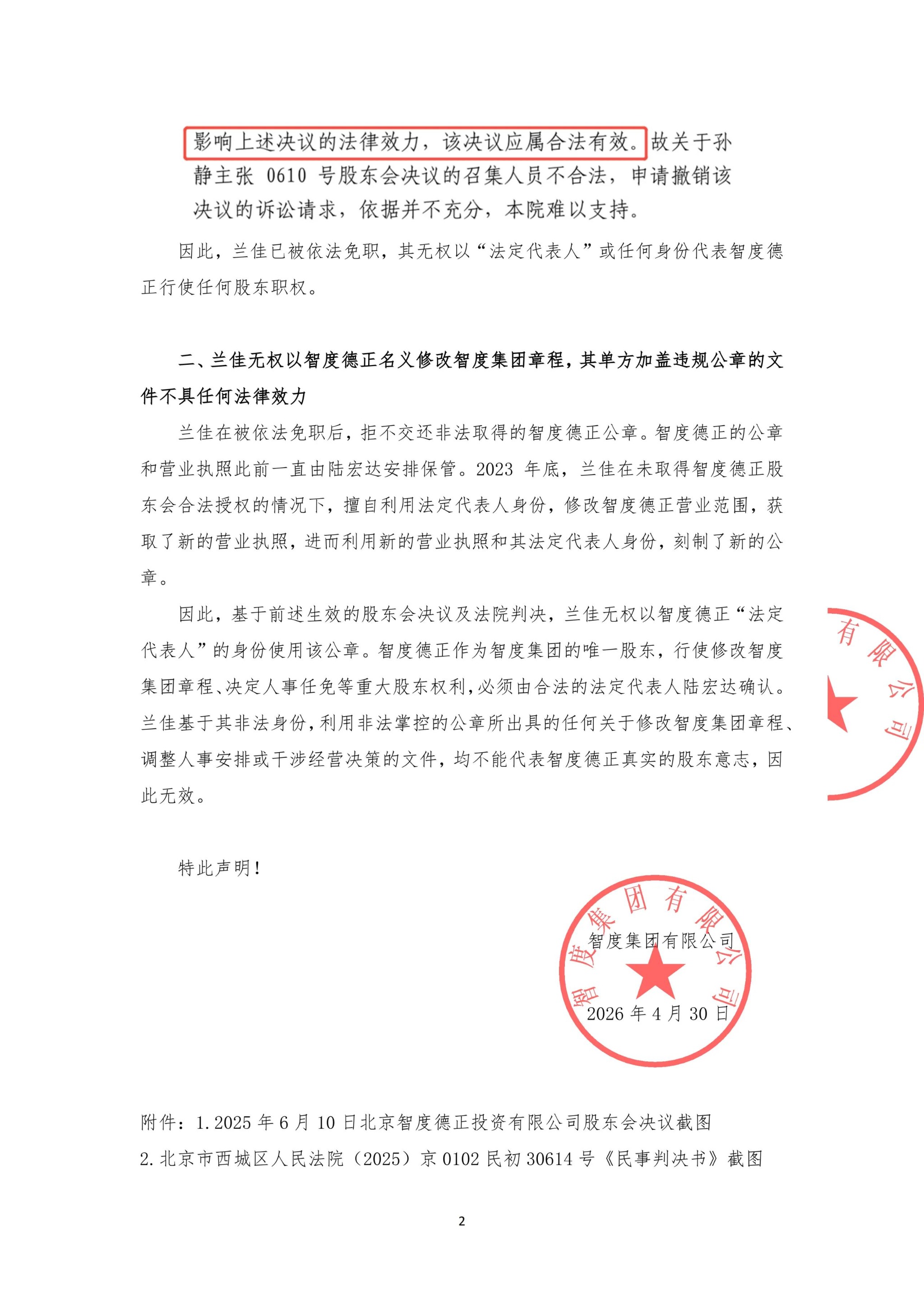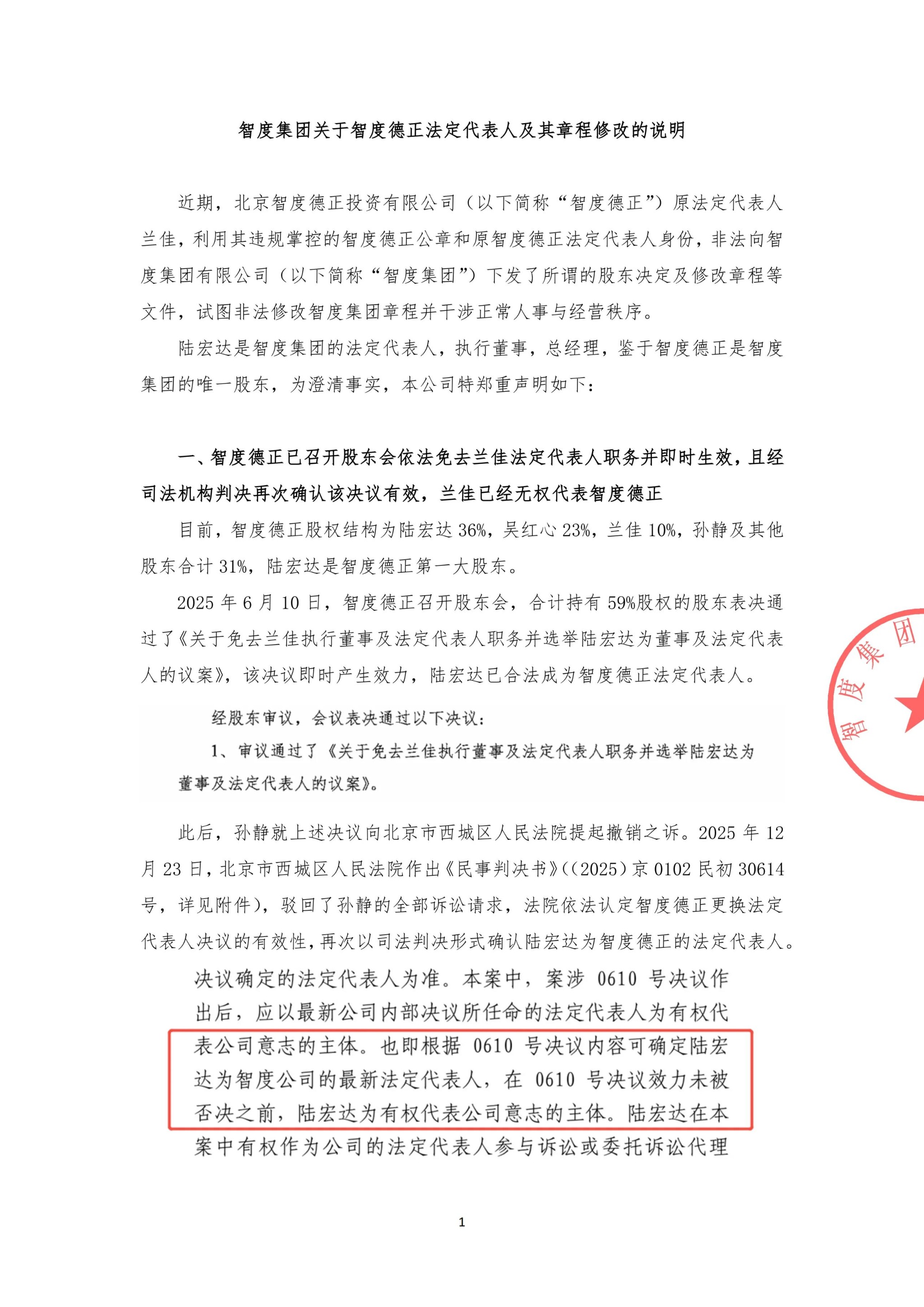 4月30日,智度集团发布关于智度德正法人及章程修改的说明:近期,智度德正原法定代表人兰佳,利用其违规掌控的智度德正公章和原智度德正法定代表人身份,非法向智度集团下发了所谓的股东决定及修改章程等文件,试图非法修改智度集团章程并干涉正常人事与经营秩序。智度集团表示,智度德正已召开股东会依法免去兰佳法定代表人职务并即时生效,且经司法机构判决再次确认该决议有效,兰佳已经无权代表智度德正。目前,智度德正股权结构为陆宏达36%,吴红心23%,兰佳10%,孙静及其他股东合计31%,陆宏达是智度德正第一大股东。智度德正作为智度集团的唯一股东,行使修改智度集团章程、决定人事任免等重大股东权利,必须由合法的法定代表人陆宏达确认。