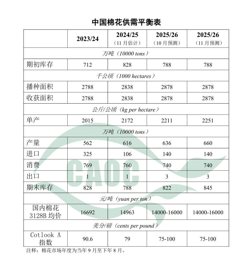 2025/26年度棉花采收基本结束,生长期气象条件良好,单产明显提升,本月将棉花单产由每公顷2211公斤上调至2251公斤,增幅1.8%,产量调增至660万吨。新棉采收进度快于上年,购销总体顺利。据中国棉花网数据,截至11月6日,全国棉花采摘进度95.3%,同比提高1.3个百分点,销售率18.3%,同比提高12.2个百分点。