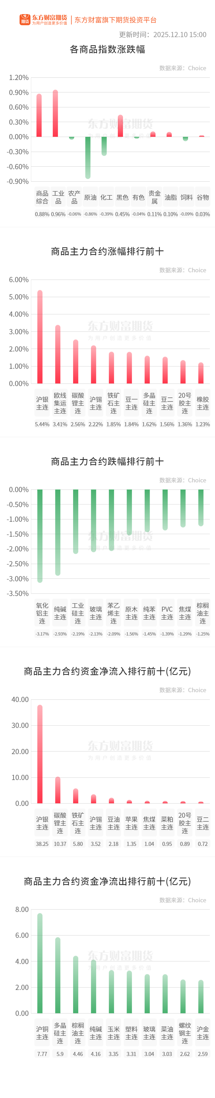 钢材:截止12月10日当周,据找钢网数据显示,全国重点钢材品种产量418.08万吨,较上周减少17.01万吨;厂库368.94万吨,较上周减少6.42万吨;社库425.75万吨,较上周减少22.04万吨;总库存794.69万吨,较上周减少28.46万吨;表需446.54万吨,较上周减少30.53万吨。(找钢网)