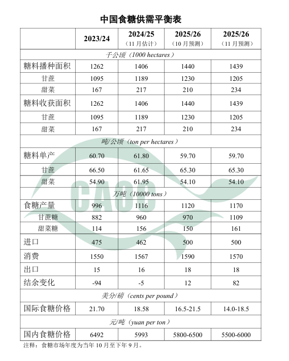 2024/25年度中国食糖产销结束,累计产糖1116万吨,较上年度增加120万吨;食糖年度均价为每吨5993元,在预测范围内,比上年度每吨跌498元,跌幅7.7%;国际原糖年度均价为每磅18.58美分,在预测范围内,比上年度每磅下跌3.1美分,跌幅14.3%。本月对2025/26年度中国食糖供需形势预测与上月保持一致。8月份内蒙古降雨偏多,不利于甜菜糖分积累及起收,糖厂开机时间推迟,对甜菜糖产量的影响需进一步跟踪评估。9月底10月初广东、广西等甘蔗主产区受台风影响,出现甘蔗倒伏等现象,后期需持续关注灾后甘蔗生长恢复情况。