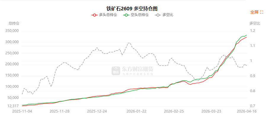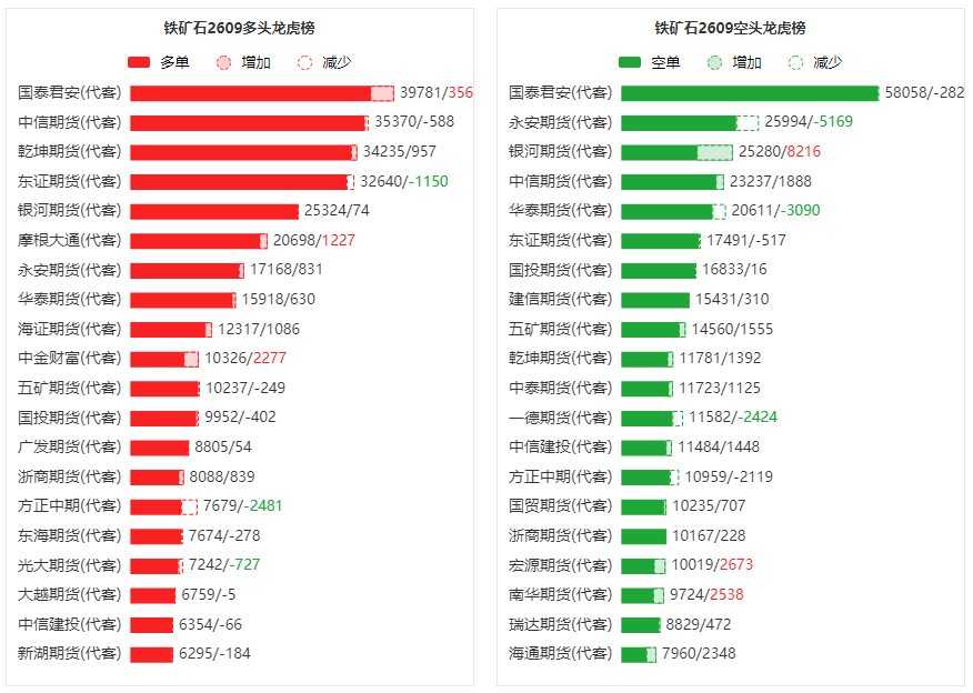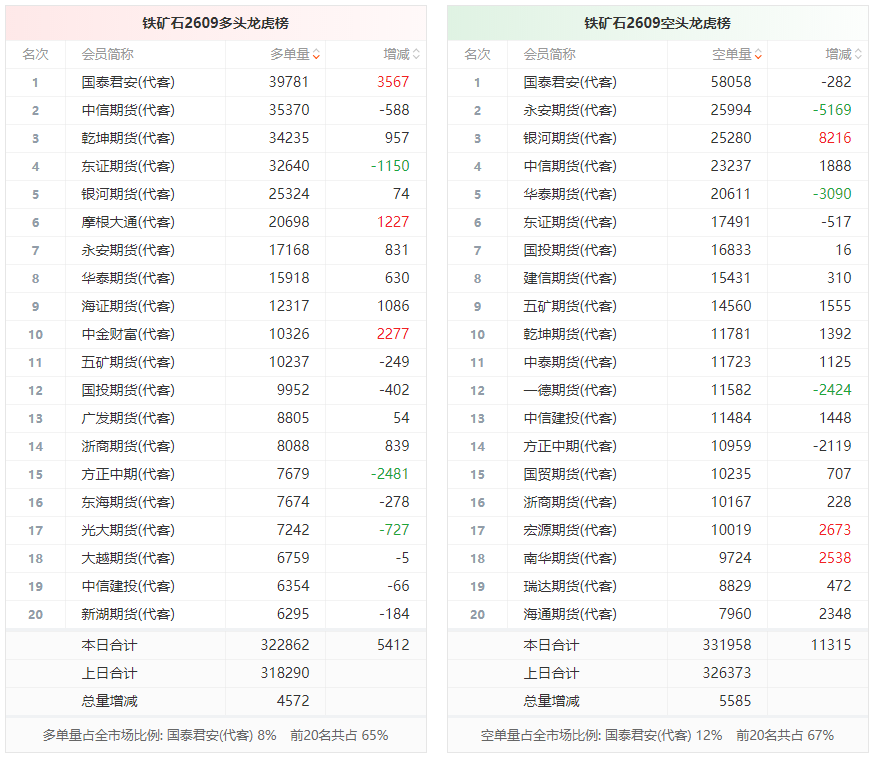 总体而言,铁矿石2609合约今日增仓上行,多空持仓排名前20席中,多空双方均呈进场态势,多头进场意愿弱于空头。