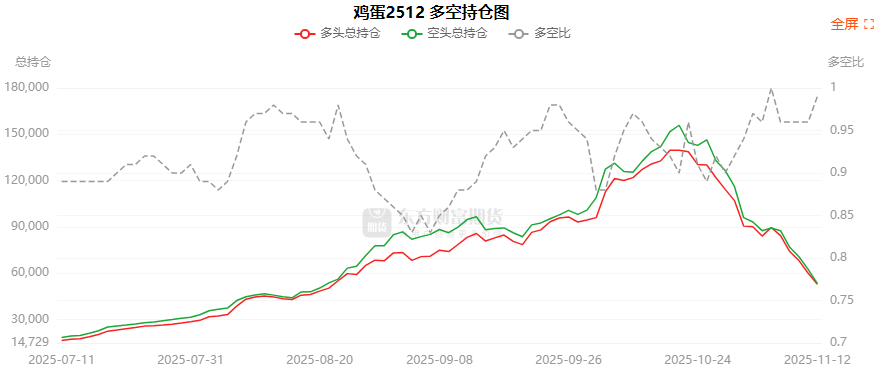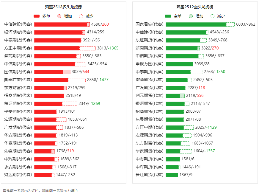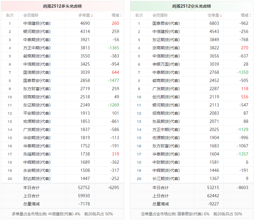 总体而言,鸡蛋2512合约今日减仓下行,多空持仓排名前20席中,多空双方均呈退场态势,多头退场意愿弱于空头。