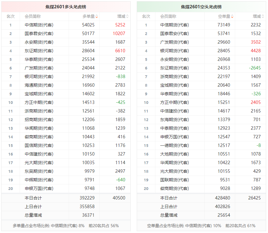 总体而言,焦煤2601合约今日增仓上行,多空持仓排名前20席中,多空双方均呈进场态势,多头进场意愿强于空头。