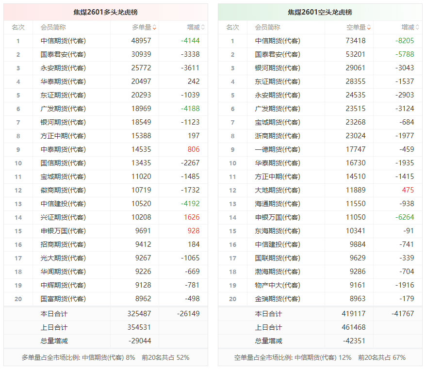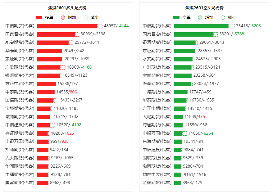 总体而言,焦煤2601合约今日减仓下行,多空持仓排名前20席中,多空双方均呈退场态势,多头退场意愿弱于空头。
