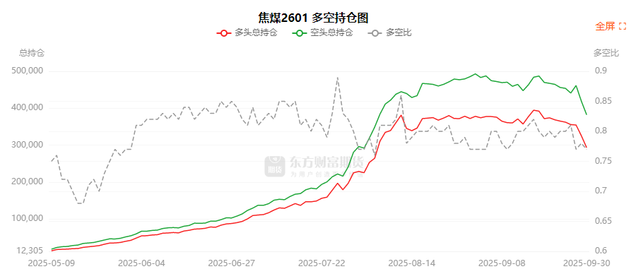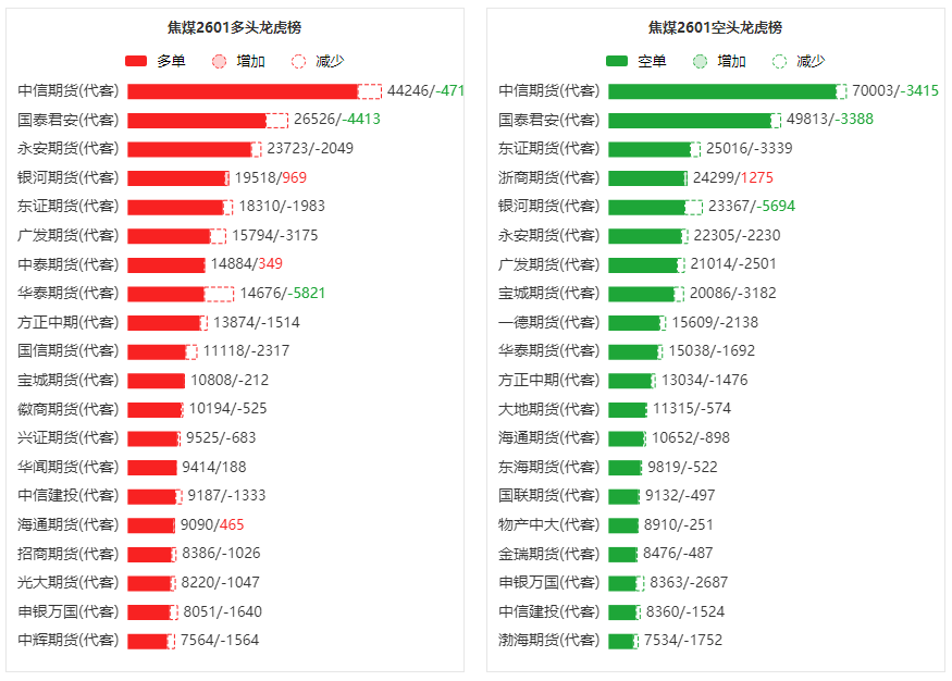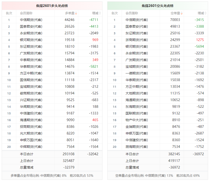 总体而言,焦煤2601合约今日减仓下行,多空持仓排名前20席中,多空双方均呈退场态势,多头退场意愿弱于空头。