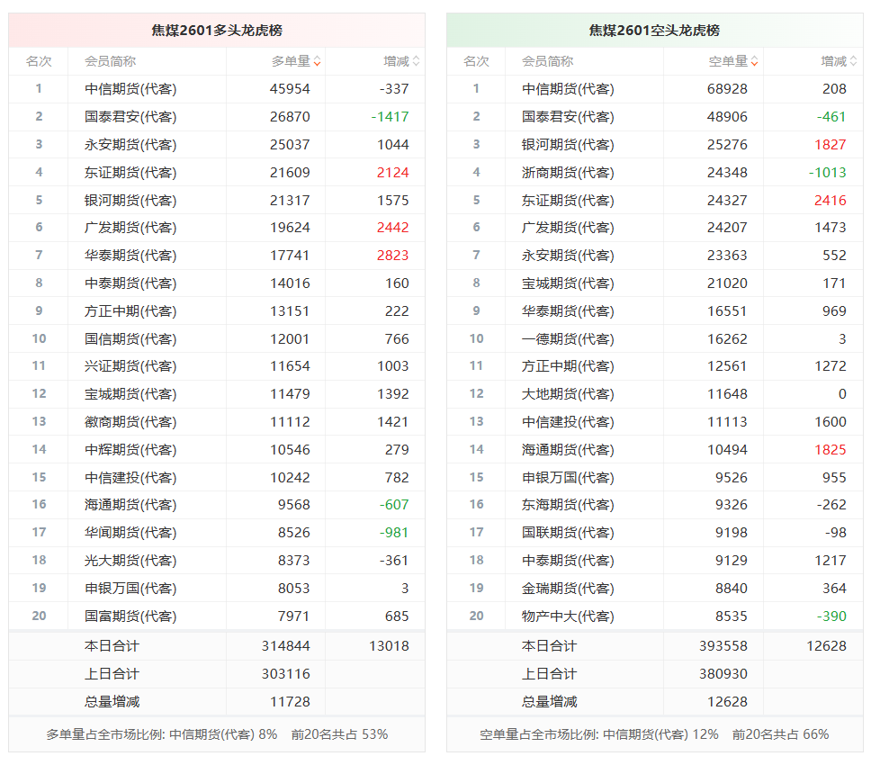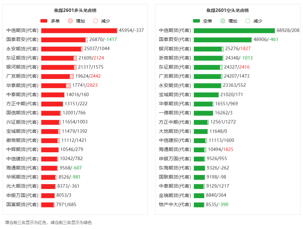 总体而言,焦煤2601合约今日增仓上行,多空持仓排名前20席中,多空双方均呈进场态势,多头进场意愿弱于空头。