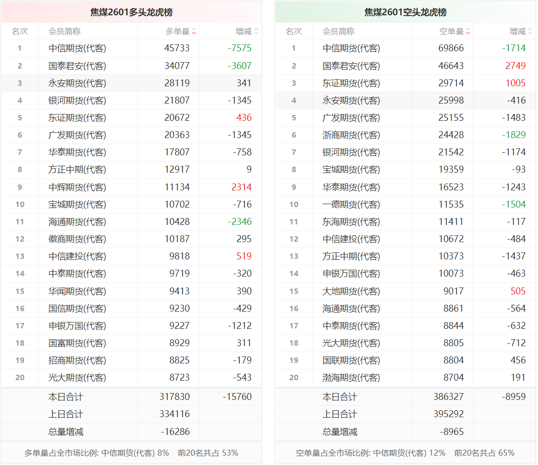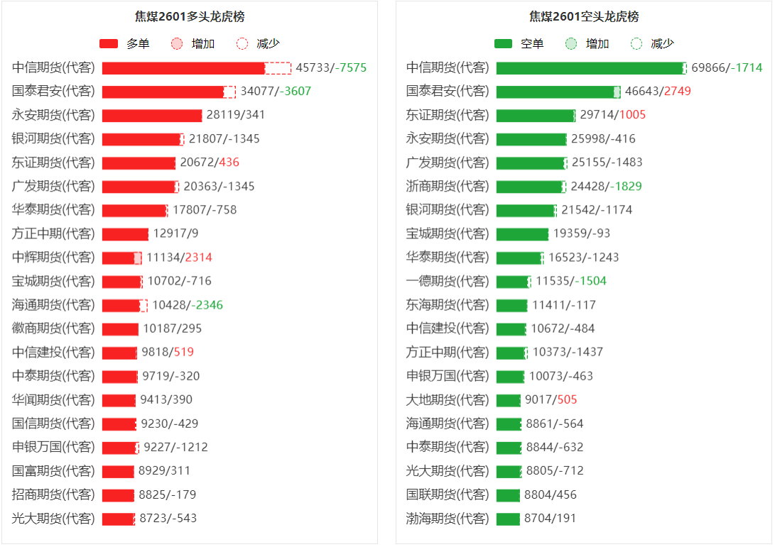 总体而言,焦煤2601合约今日减仓下行,多空持仓排名前20席中,多空双方均呈退场态势,多头退场意愿强于空头。