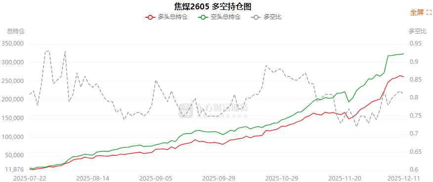 总体而言,焦煤2605合约今日增仓下行,多空持仓排名前20席中,多方呈退场态势,空方呈进场态势。