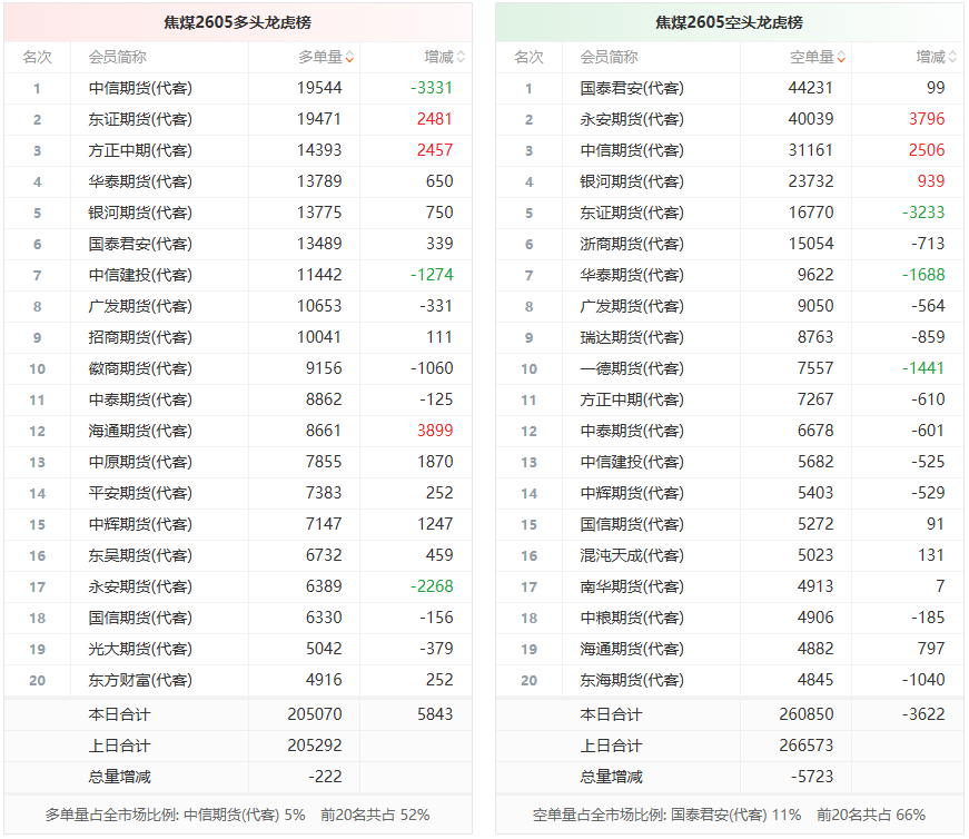 总体而言,焦煤2605合约今日减仓下行,多空持仓排名前20席中,多空双方均呈退场态势,多头退场意愿弱于空头。