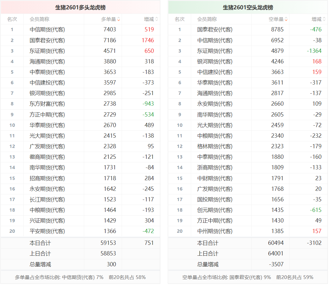 总体而言,生猪2601合约今日减仓上行,多空持仓排名前20席中,多方呈进场态势,空方呈退场态势。