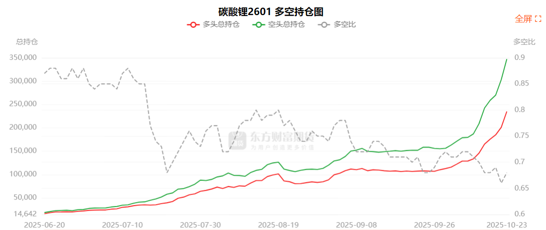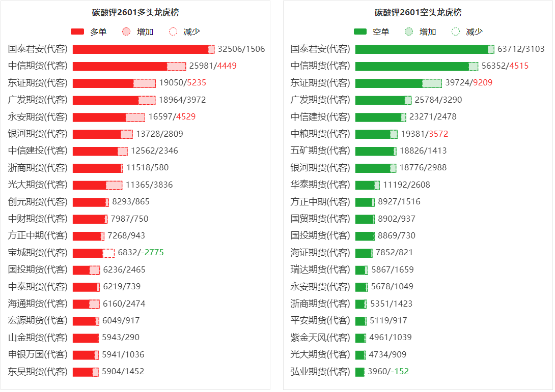 总体而言,碳酸锂2601合约今日增仓上行,多空持仓排名前20席中,多空双方均呈进场态势,多头进场意愿弱于空头。