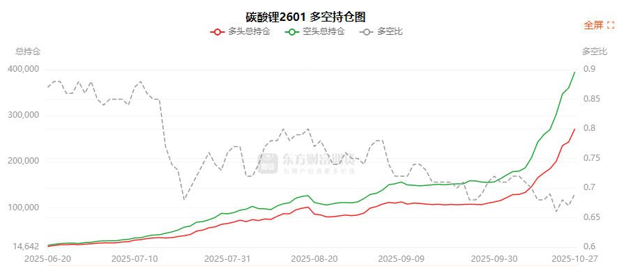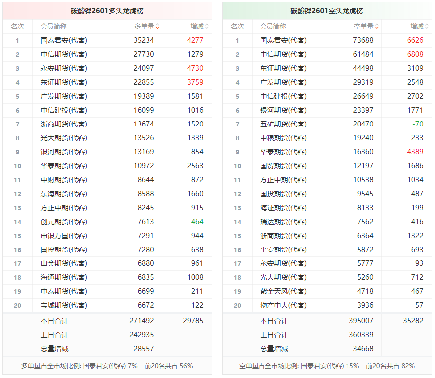 总体而言,碳酸锂2601合约今日增仓上行,多空持仓排名前20席中,多空双方均呈进场态势,多头进场意愿弱于空头。