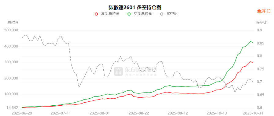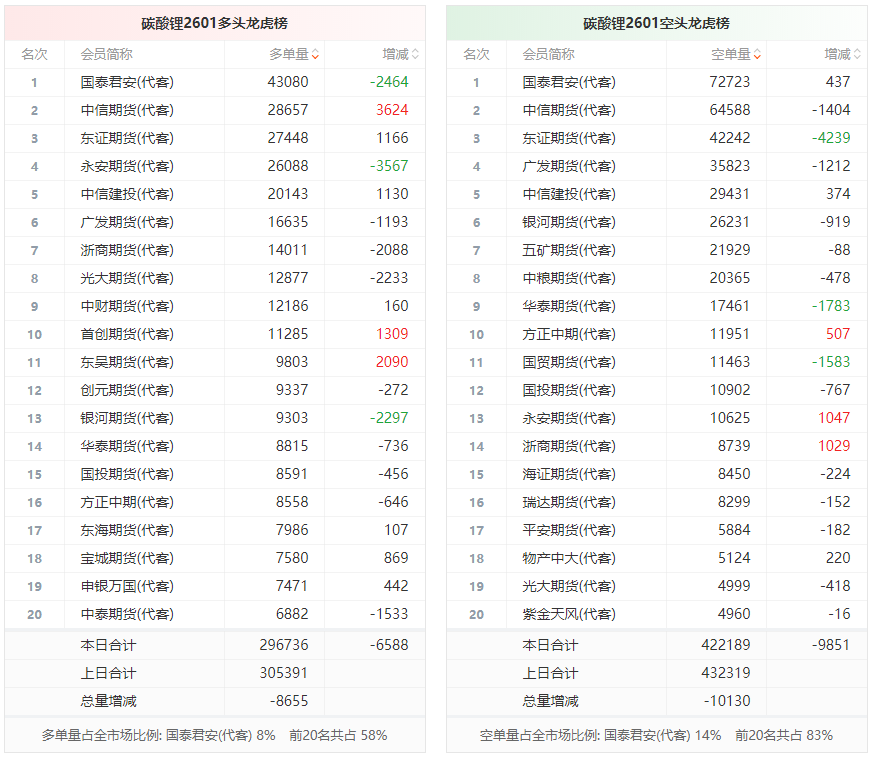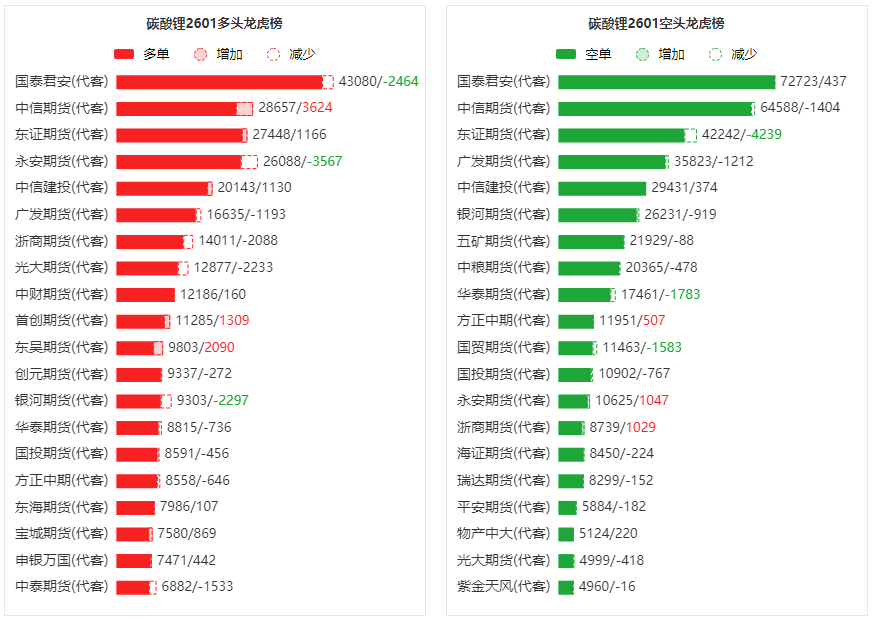 总体而言,碳酸锂2601合约今日减仓下行,多空持仓排名前20席中,多空双方均呈退场态势,多头退场意愿弱于空头。
