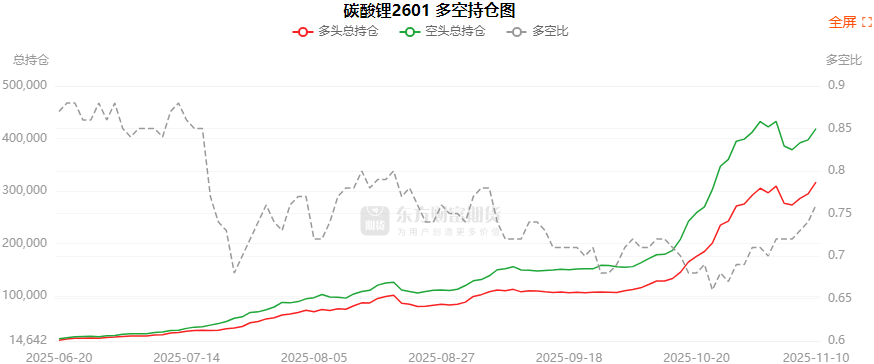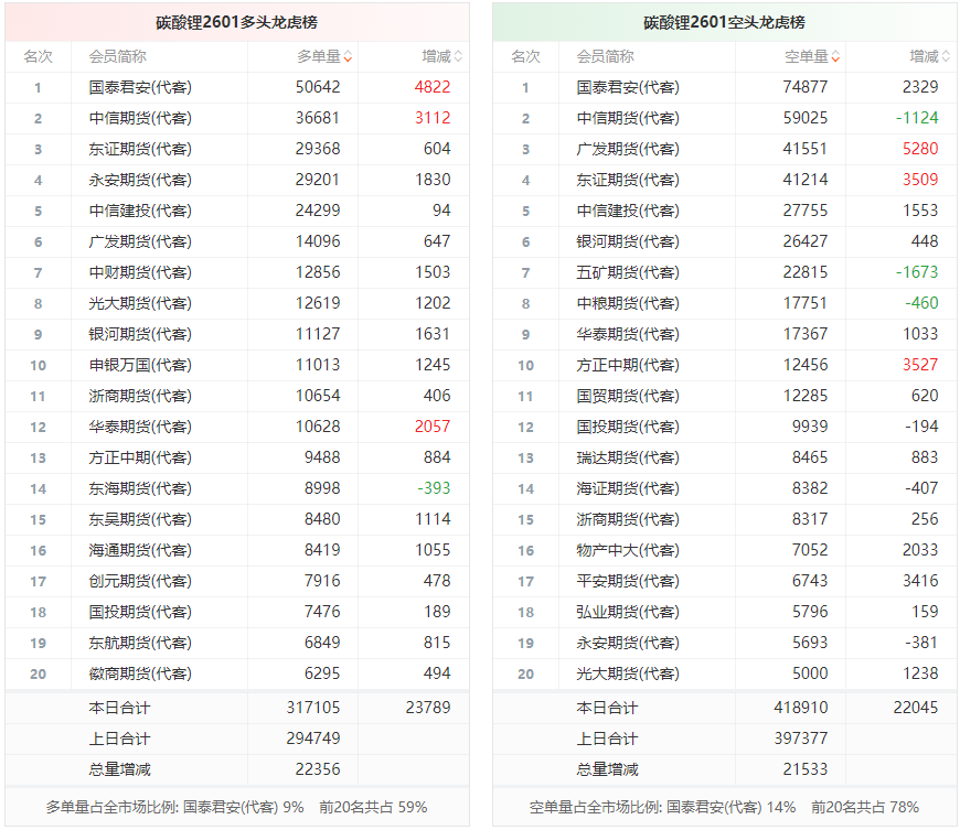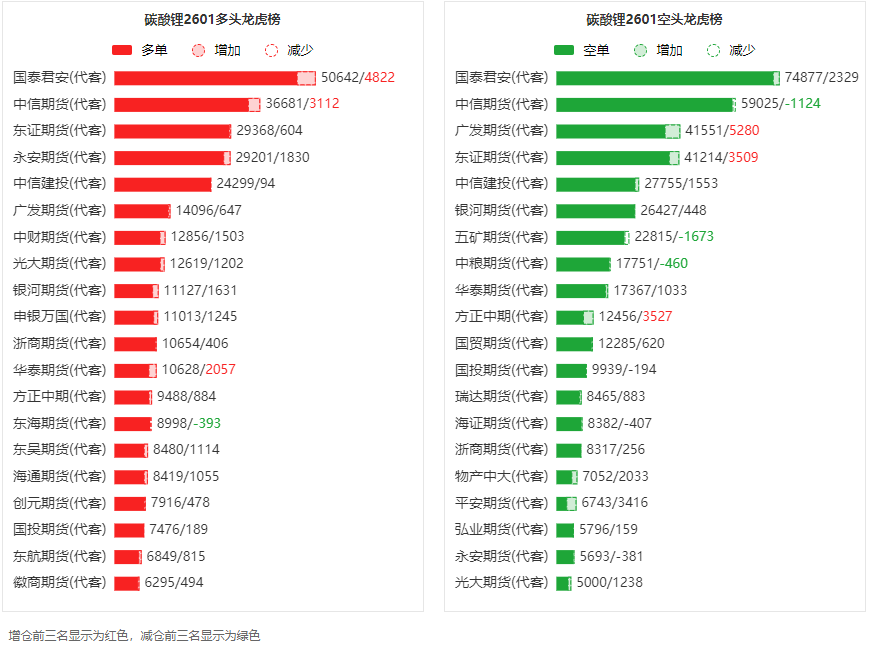 总体而言,碳酸锂2601合约今日增仓上行,多空持仓排名前20席中,多空双方均呈进场态势,多头进场意愿强于空头。