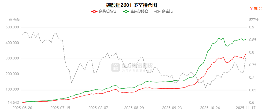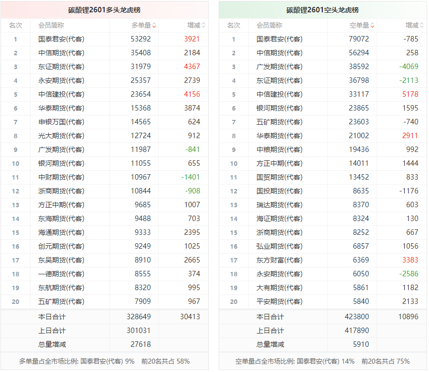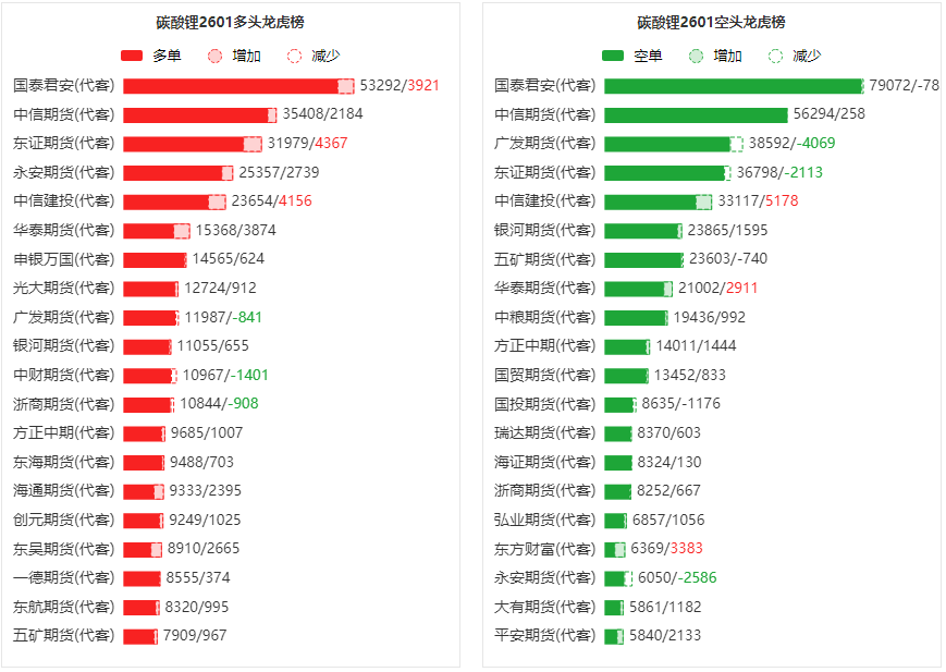总体而言,碳酸锂2601合约今日增仓上行,多空持仓排名前20席中,多空双方均呈进场态势,多头进场意愿强于空头。