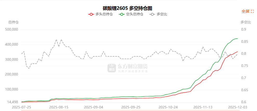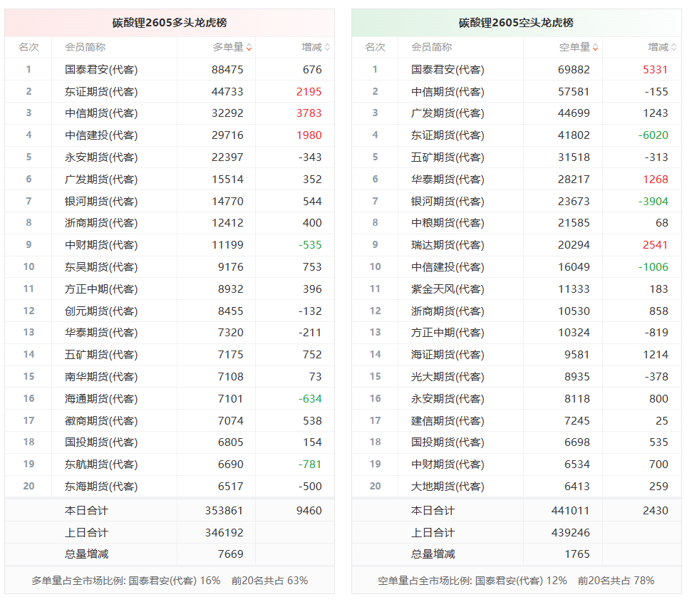 总体而言,碳酸锂2605合约今日增仓下行,多空持仓排名前20席中,多空双方均呈进场态势,多头进场意愿强于空头。
