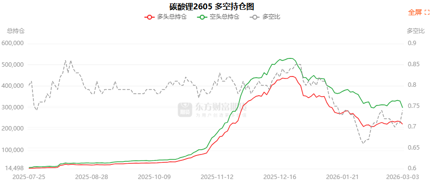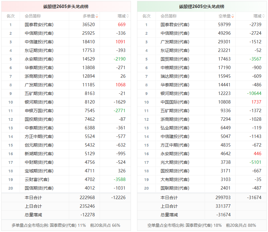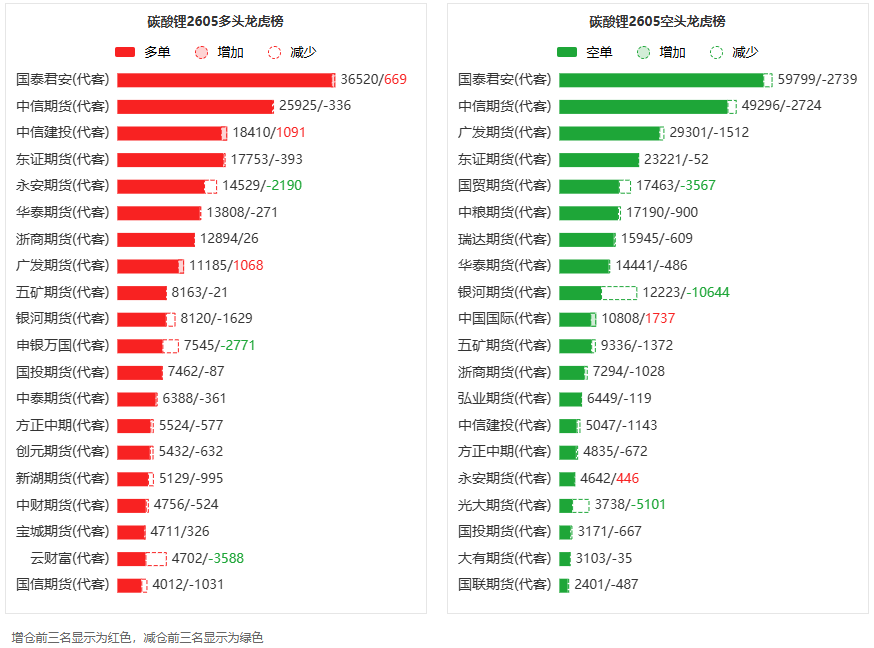总体而言,碳酸锂2605合约今日减仓下行,多空持仓排名前20席中,多空双方均呈退场态势,多头退场意愿弱于空头。