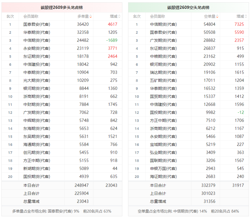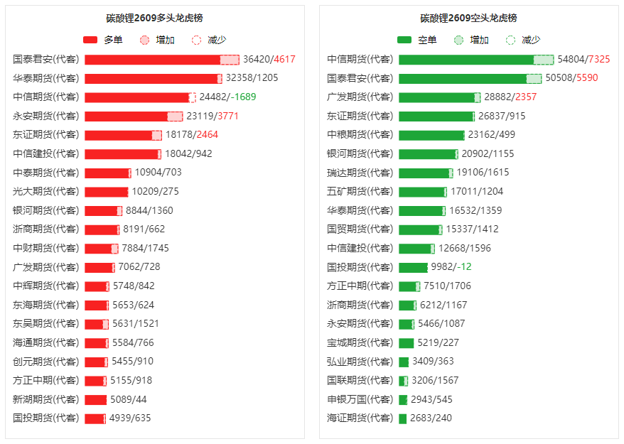 总体而言,碳酸锂2609合约今日增仓上行,多空持仓排名前20席中,多空双方均呈进场态势,多头进场意愿弱于空头。