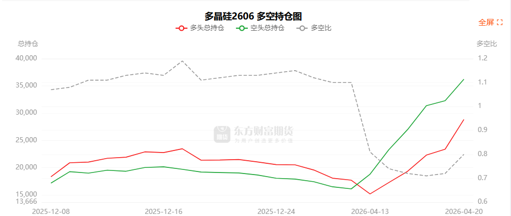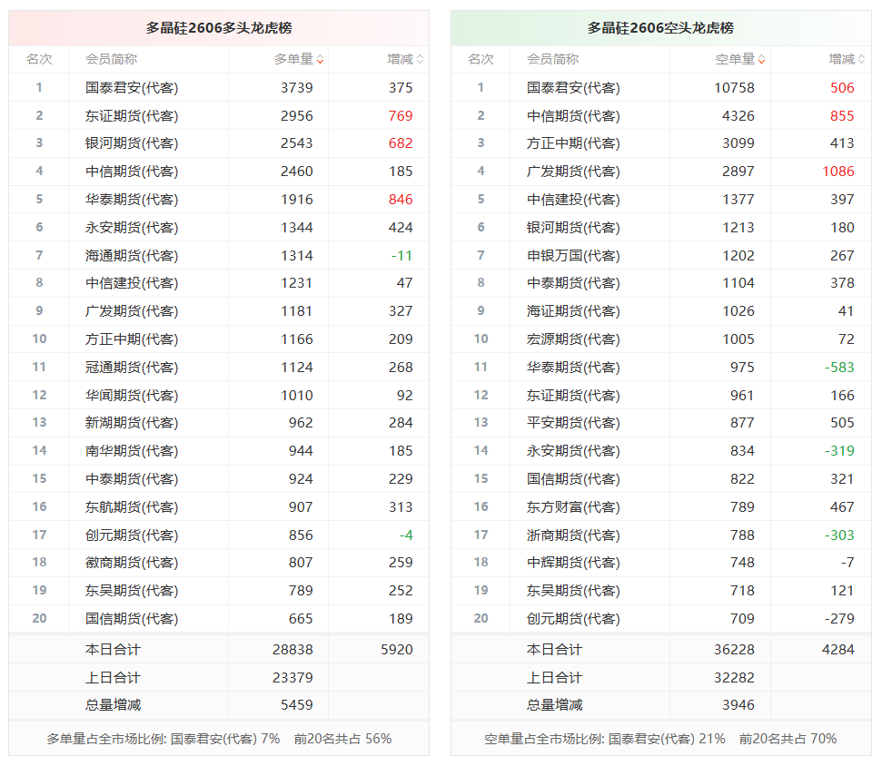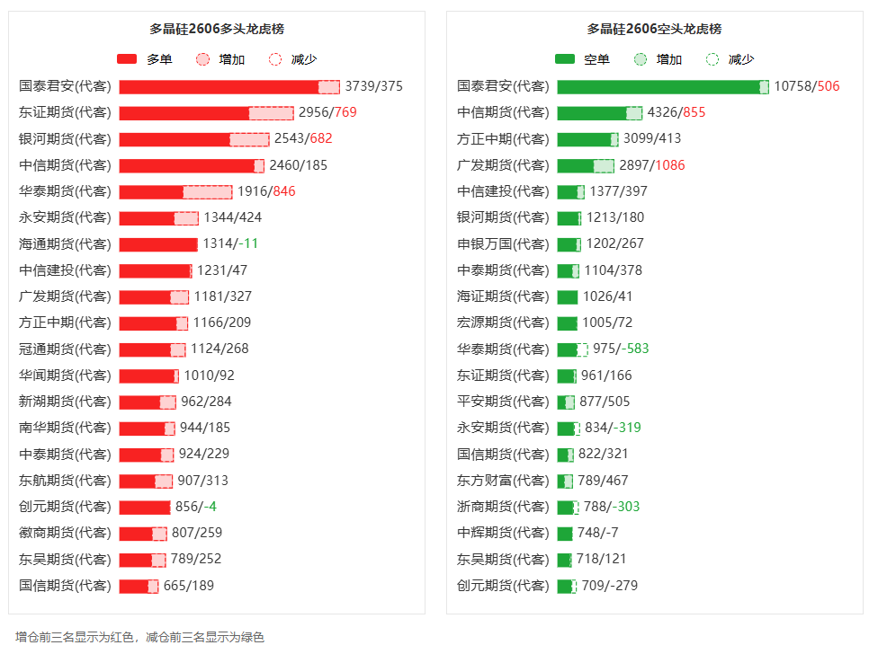 总体而言,多晶硅2606合约今日增仓上行,多空持仓排名前20席中,多空双方均呈进场态势,多头进场意愿强于空头。