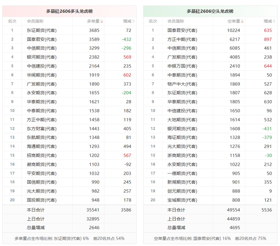 总体而言,多晶硅2606合约今日增仓下行,多空持仓排名前20席中,多空双方均呈进场态势,多头进场意愿弱于空头。