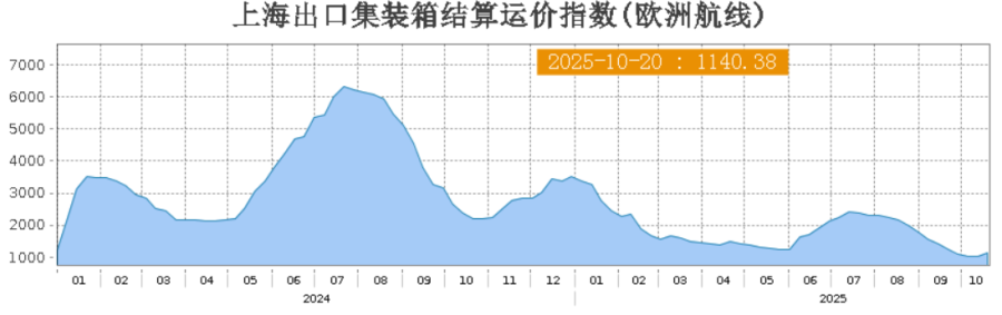 据上海航运交易所数据,截至2025年10月20日,上海出口集装箱结算运价指数(欧洲航线)报1140.38点,与上期相比涨10.5%。