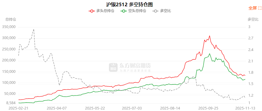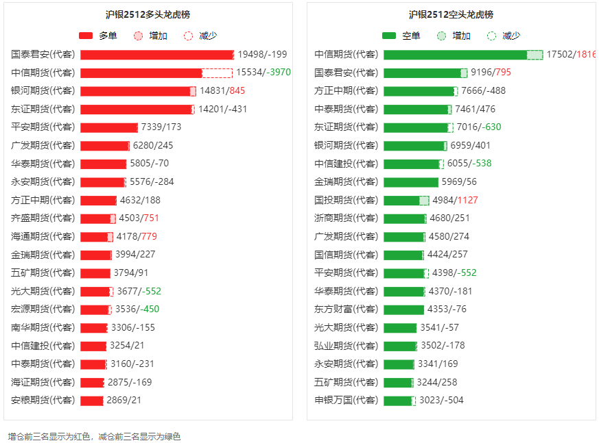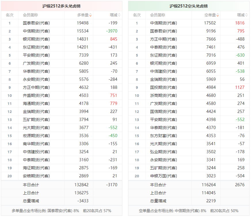 总体而言,沪银2512合约今日减仓上行,多空持仓排名前20席中,多方呈退场态势,空方呈进场态势。