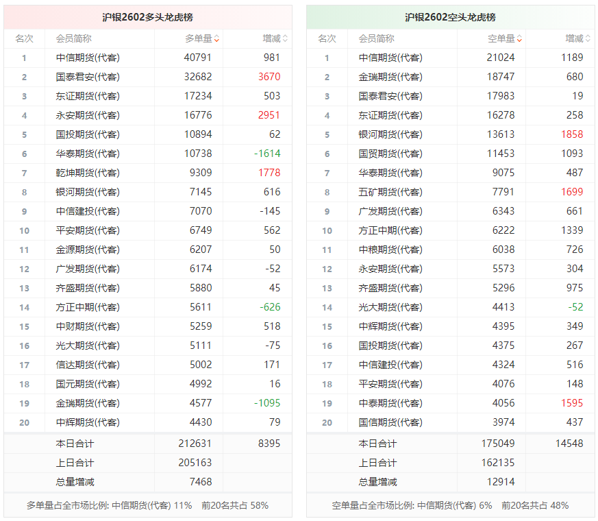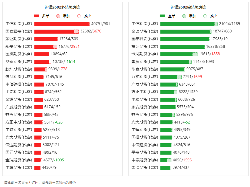 总体而言,沪银2602合约今日增仓上行,多空持仓排名前20席中,多空双方均呈进场态势,多头进场意愿弱于空头。