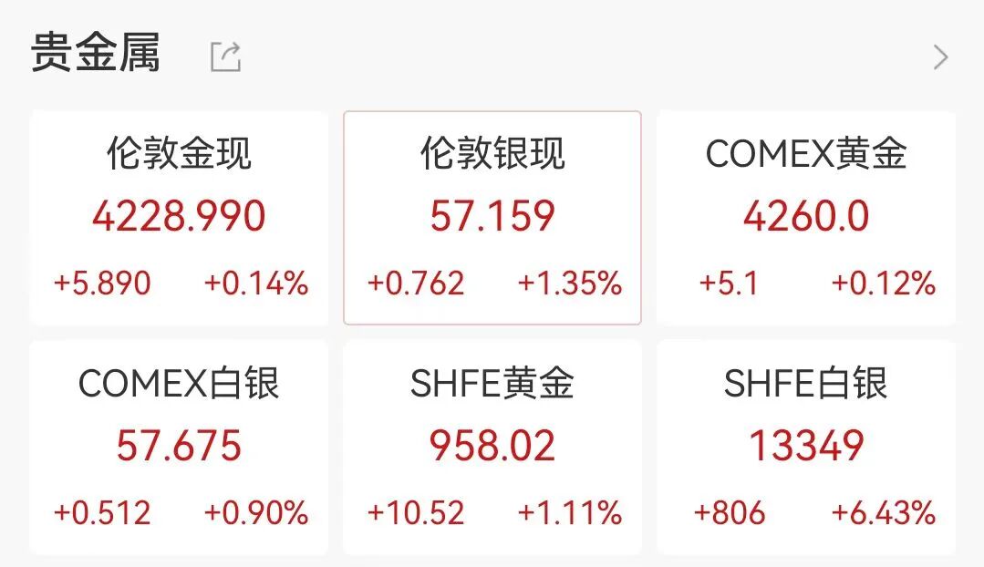 12月1日早盘,贵金属板块继续上涨。截至9:28发稿,现货白银历史首次触及57美元/盎司,日内涨超1%,年内涨幅超98%,COMEX白银首次突破58美元/盎司,沪银涨超6%,续创新高。A股早盘贵金属概念拉升,白银有色涨停,兴业银锡、湖南白银、豫光金铅、盛达资源跟涨。